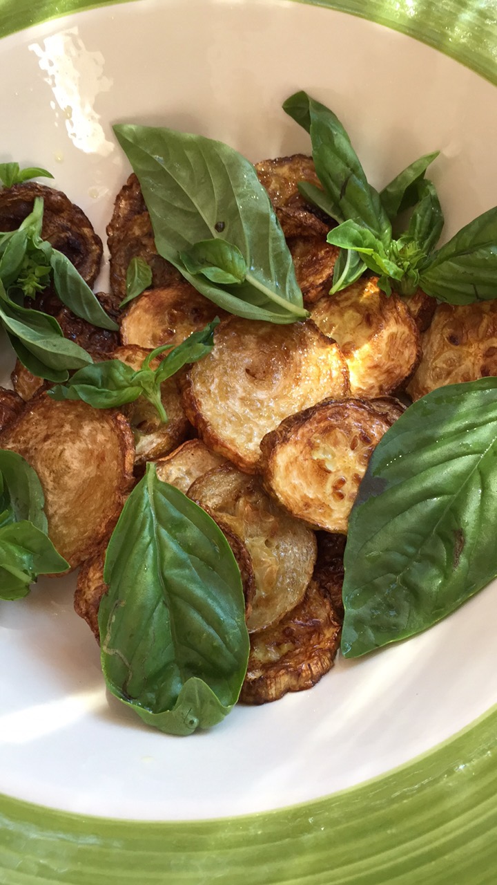 Friggetele in abbondante olio d’oliva lasciandole scolare leggermente su della carta assorbente (non troppo, l’olio questa volta vi servirà!) e raccoglietele in un piatto fondo insieme alle foglie del basilico fresco.