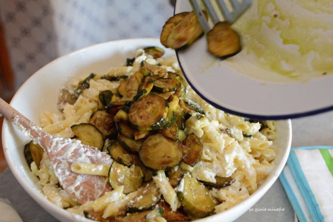 Versate la pasta in una ciotola capiente, aggiungete le zucchine e l’olio rimasto sul fondo del piatto, mescolate delicatamente aggiungendo a cucchiai la ricotta. Quella che abbiamo utilizzato in campagna era ancora tiepida e molto morbida, se volete rendere la vostra più cremosa, potrete stemperarla con qualche cucchiaio dell’acqua di cottura prima di unirla alla pasta.
