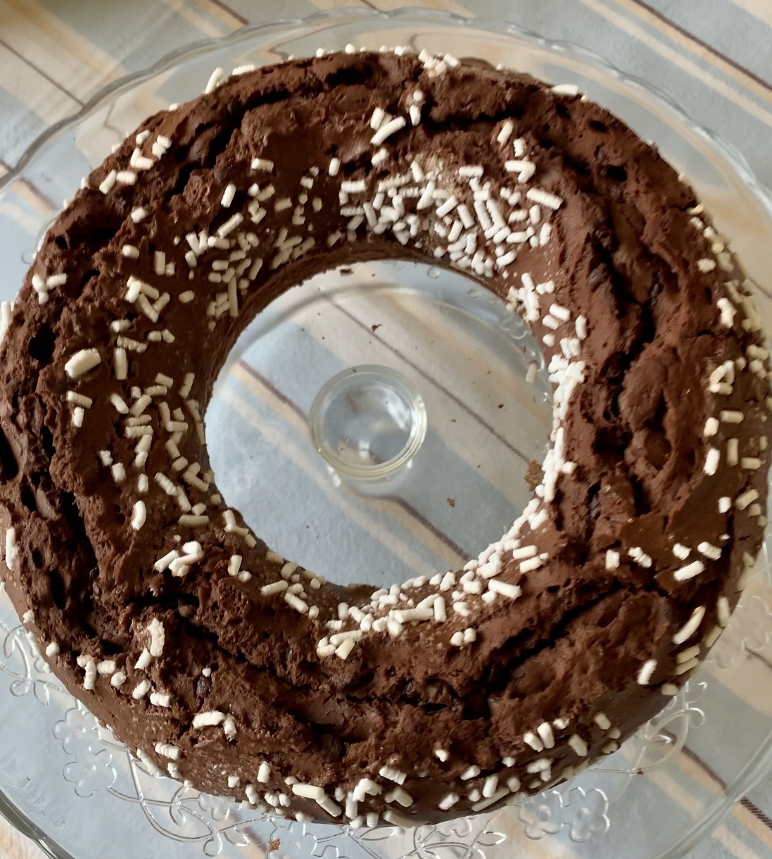 - Ungere ed infarinare uno stampo per ciambella, versare l’impasto e decorare con la granella di zucchero.