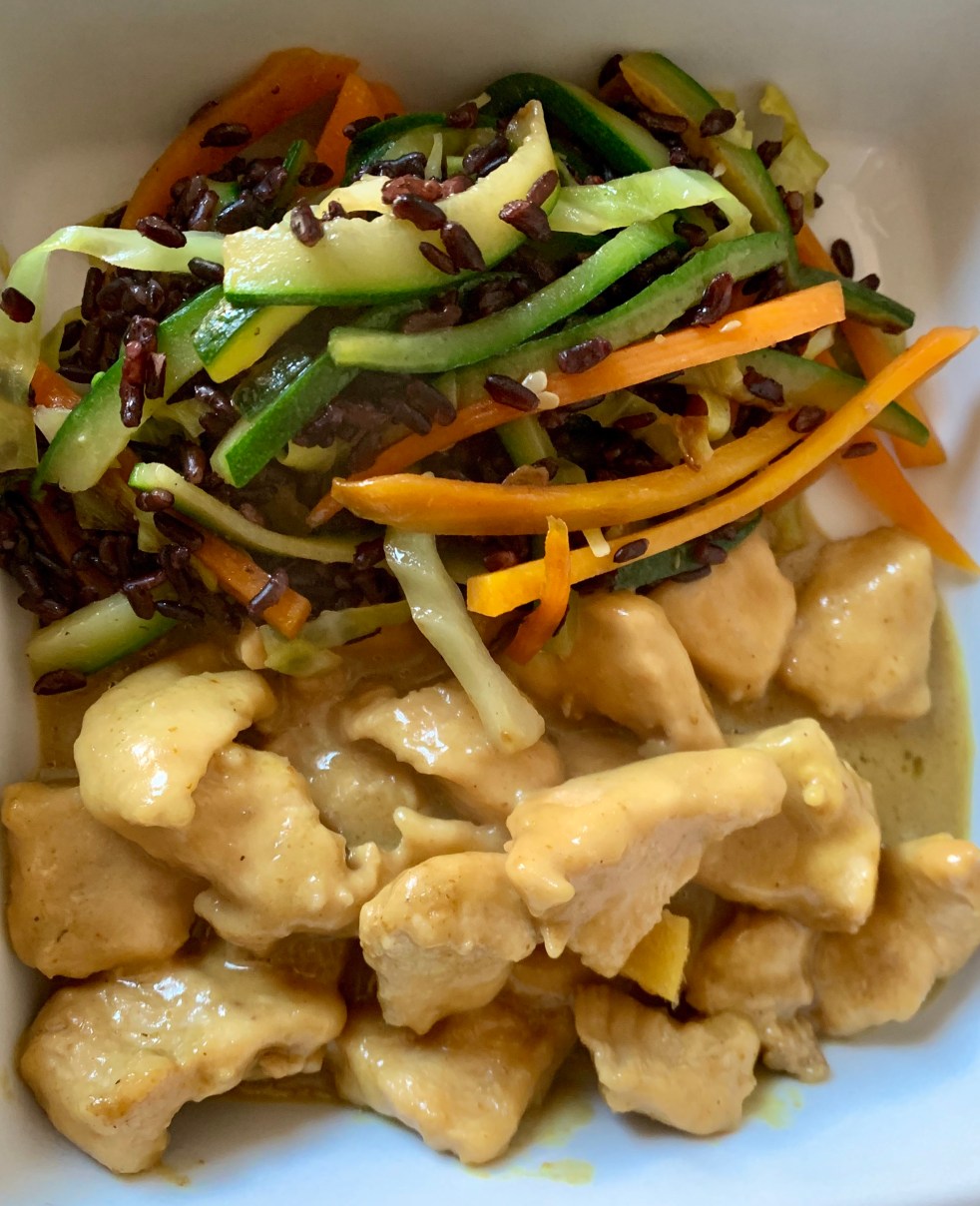 Piatto detox ma saporito per tutta la famiglia! Una versione super leggera del pollo al curry, senza aglio e senza cipolla, accompagnato da verdure croccanti e riso nero!